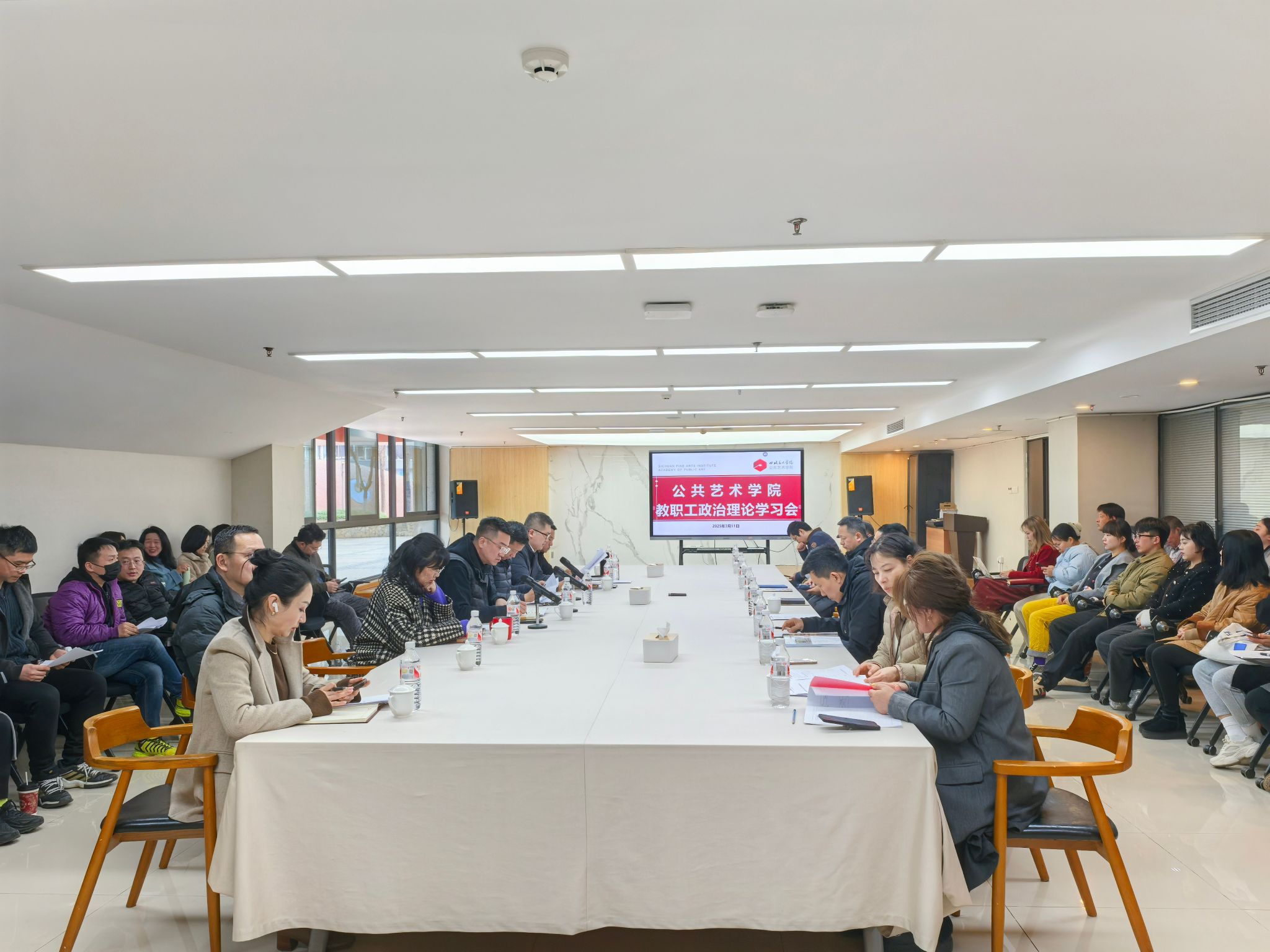 3月11日下午,公共艺术学院在黄桷坪校区四会议室召开新学期开学教职工理论学习会。会议内容涵盖两会精神学习、学校工作要点解读等重要内容,旨在提升教职工思想认识,为新学期工作筑牢基础。公共艺术学院全体教职工及班子成员出席了会议,会议由党委书记雍朝永主持。