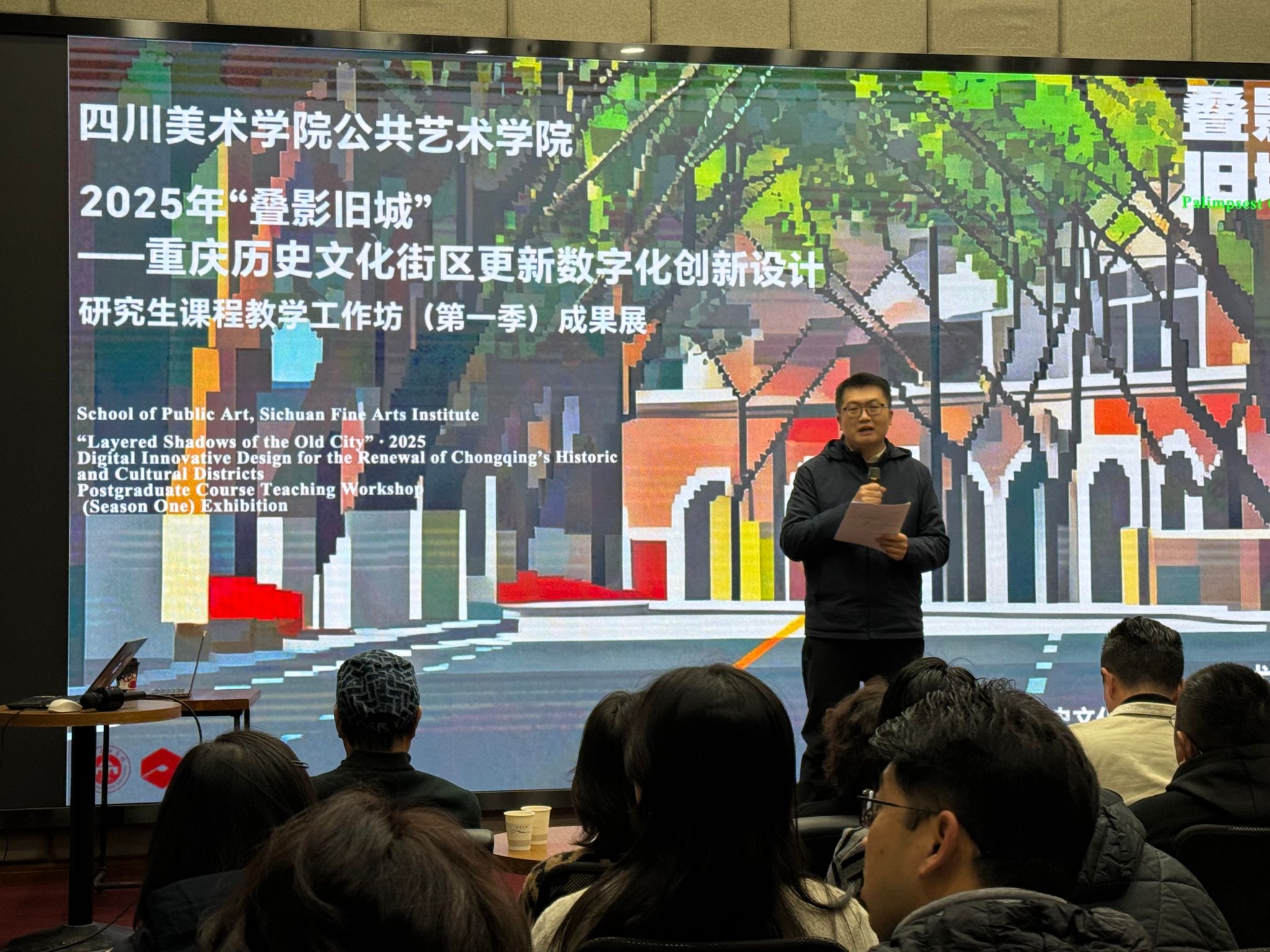 公共艺术学院“叠影旧城”- 重庆历史文化街区更新数字化创新设计研究生课程教学工作坊成果展,在中山四路渝州书房举行。重庆市规划学会、历史文化名城学术委员会、城市更新学会,以及渝中区文旅委、上清寺街道相关负责人,与学院领导、师生代表共同参加本次研究生作品展。