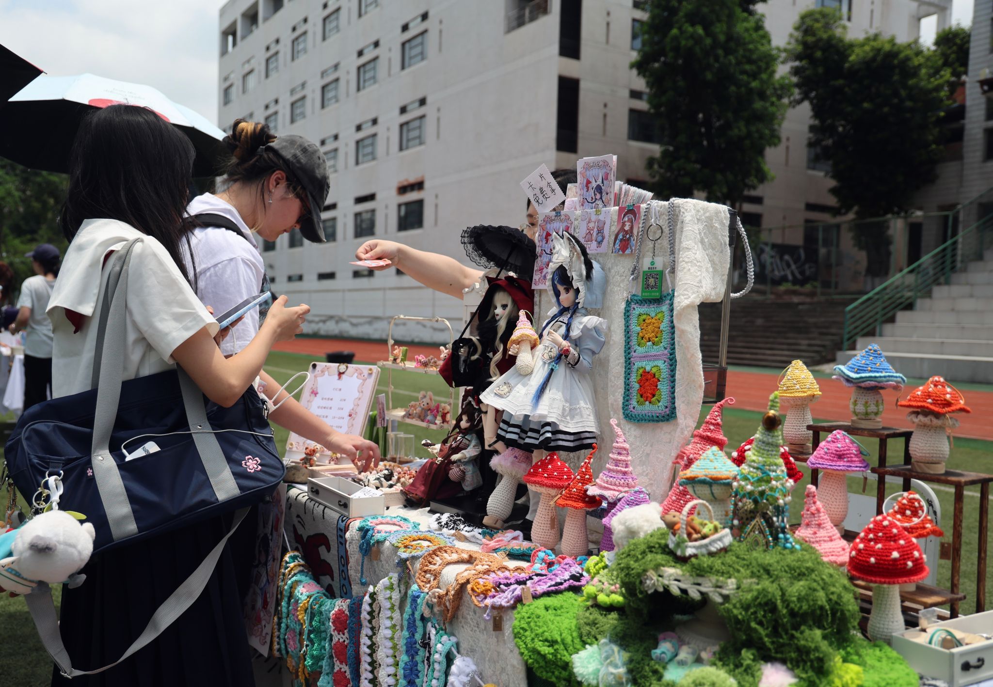 当日午间,毕业季夏日集市在黄桷坪校区操场率先推出。由在校学子自主打造的15个创意摊位摆满了琳琅满目的商品,有手工石塑项链、滴胶干花、热缩片挂件、手作陶瓷杯、手工穿戴甲、手作盲盒、鲜花花束、帆布包等,现场还设互动体验区,手工DIY让创意与灵感充分碰撞,不少商品都获得了消费者的青睐,纷纷扫码现场购买或定制,同学们的作品也在创意集市中顺利完成了从“创作”到“产品”的转换。