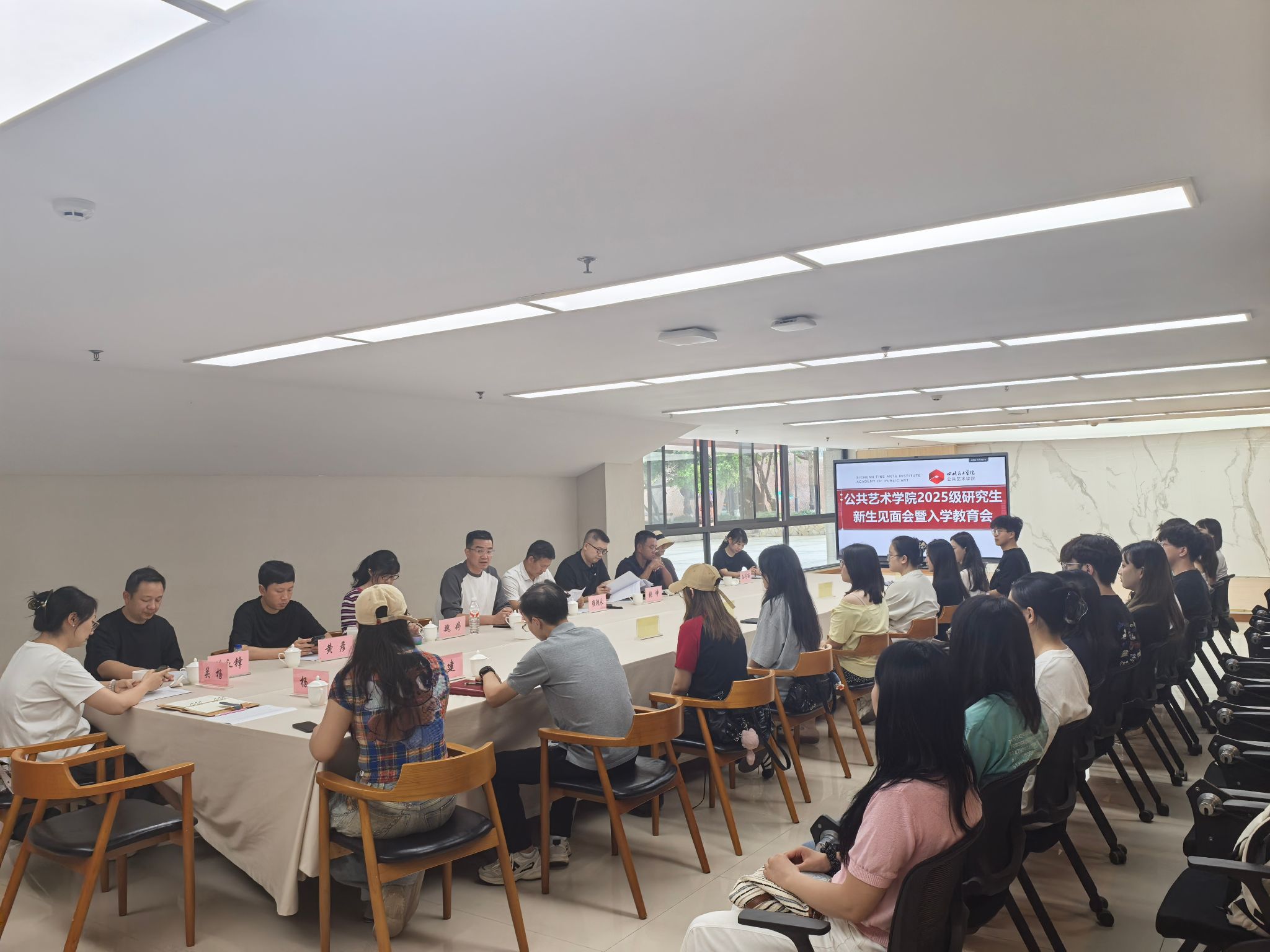 公共艺术学院2025级硕士研究生新生见面暨入学教育会在黄桷坪校区四会议室举行。学院党政领导班子成员、全体研究生导师及19名新生参加。会议由副院长魏婷主持。