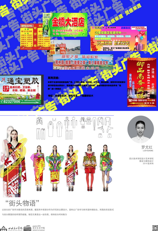 本次参与发布的作品为我校服装与服饰设计专业2018届毕业生罗尤红的毕业作品《街头物语》。该作品以街头的广告作为服装的灵感来源,截取其中某部分作为印花的主要设计,面料以广告布与帆布面料相结合,利落的西装款式与街头繁复的纹样强烈碰撞,突显出街头时尚的魅力。