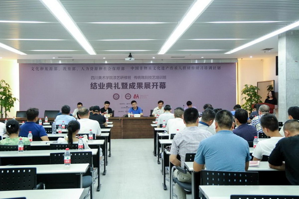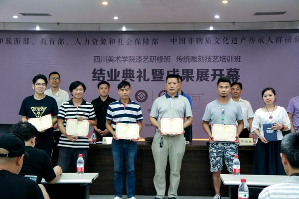 2017年10月、11月,我校分别承办了“中国非物质文化遗产传承人群研修研习培训计划” 漆艺研修班和传统雕刻技艺培训班。2018年 6月28日下午,“中国非物质文化遗产传承人群研修研习培训计划” 漆艺研修班、传统雕刻技艺培训班结业仪式在虎溪校区第五会议室举行。 纪委书记苟欣文、重庆市文化委员会非物质文化遗产处处长王发荣出席仪式,我校教务处、美术学系负责人,传统雕刻技艺培训班创作指导导师及研修班全体学员参加了仪式。仪式由美术学系艺术与文化遗产教研室主任侯波主持。