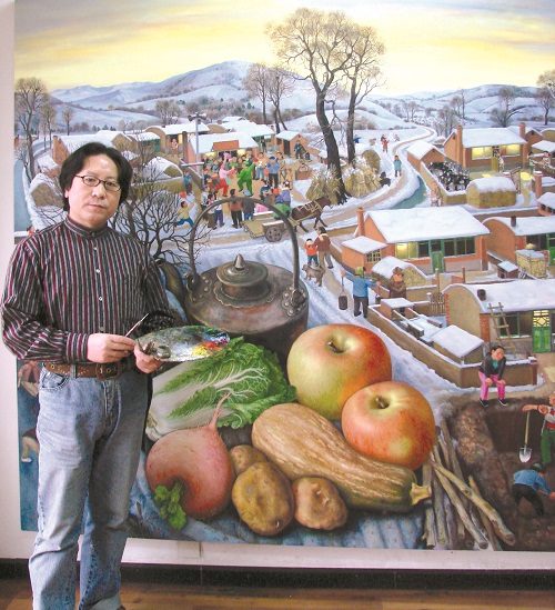 《野草滩物语》这一系列作品形成了我的创作主线。“野草滩”是我的一个艺术符号,以这个“记忆”为切入点,画出北方农村丰富多彩的生活场景。由于我是在北方农村出生长大,对那里的一切都很有感情,所以我以北方的乡土风情作为绘画基调,画出各种不同题材和体裁的绘画。