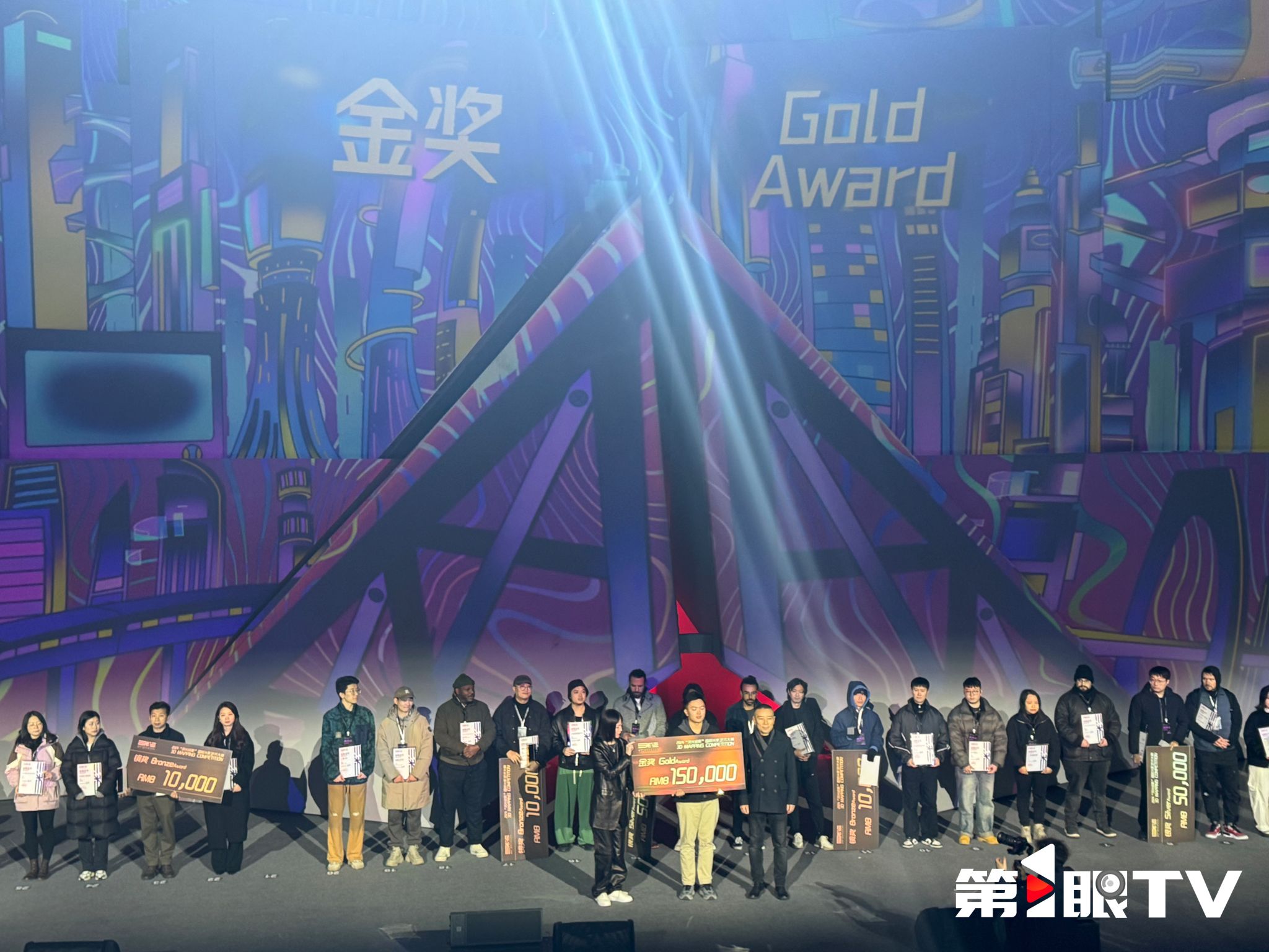 本次评审会由 院长焦兴涛担任评审委员会主任,委员共由来自匈牙利、法国、德国知名光影艺术节的策展人代表、国内知名艺术家、学者、机构负责人共同组成。评审委员会根据作品现场呈现的具体视觉效果、方案论证等内容,从作品的审美艺术性、载体契合度、创意创新度、作品完成性、艺术融合感等五个维度进行评审。最终评选出金奖(1名)银奖(2名)铜奖(3名),来自中国渲艺山河的作品《凝望》摘得金奖。