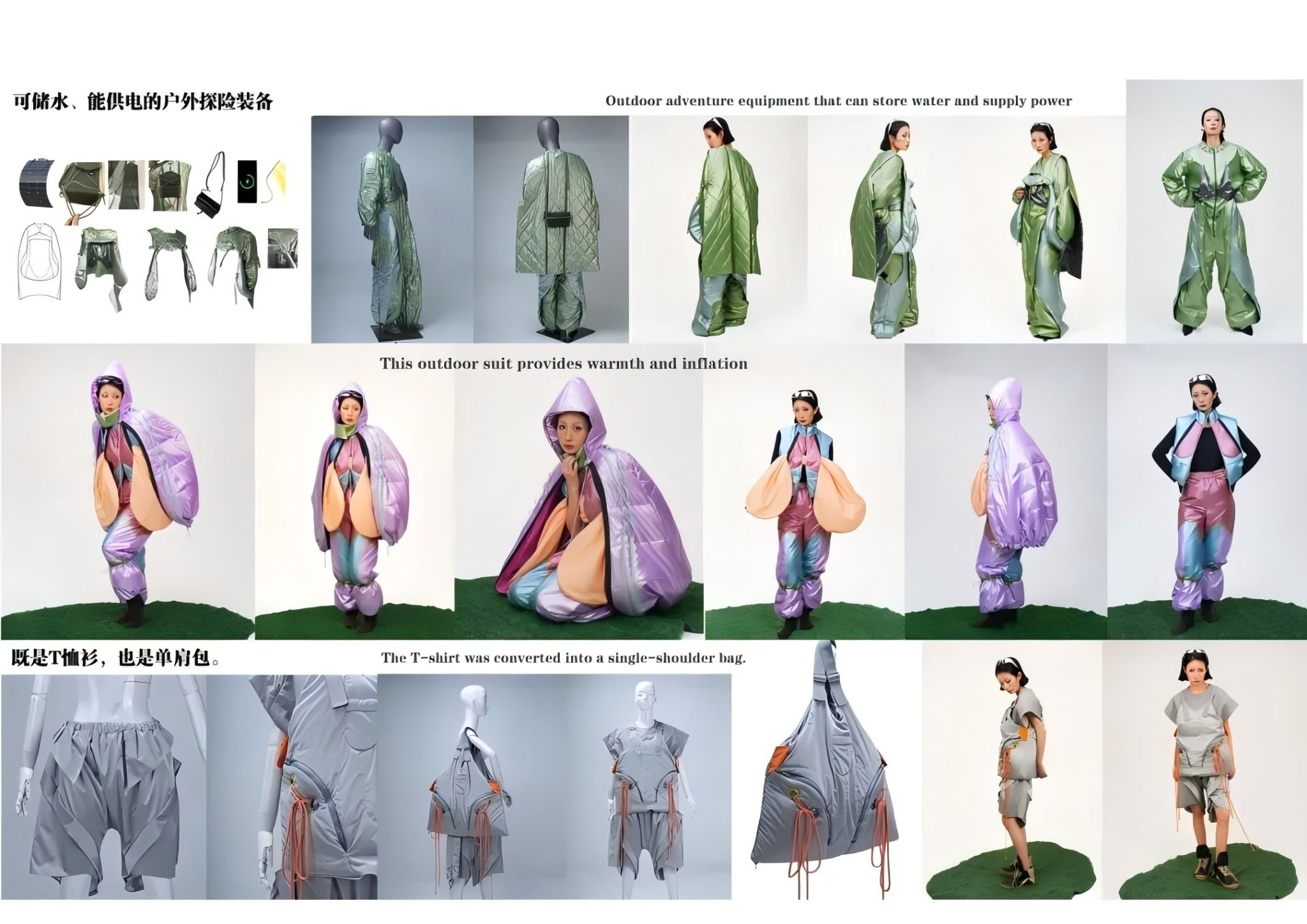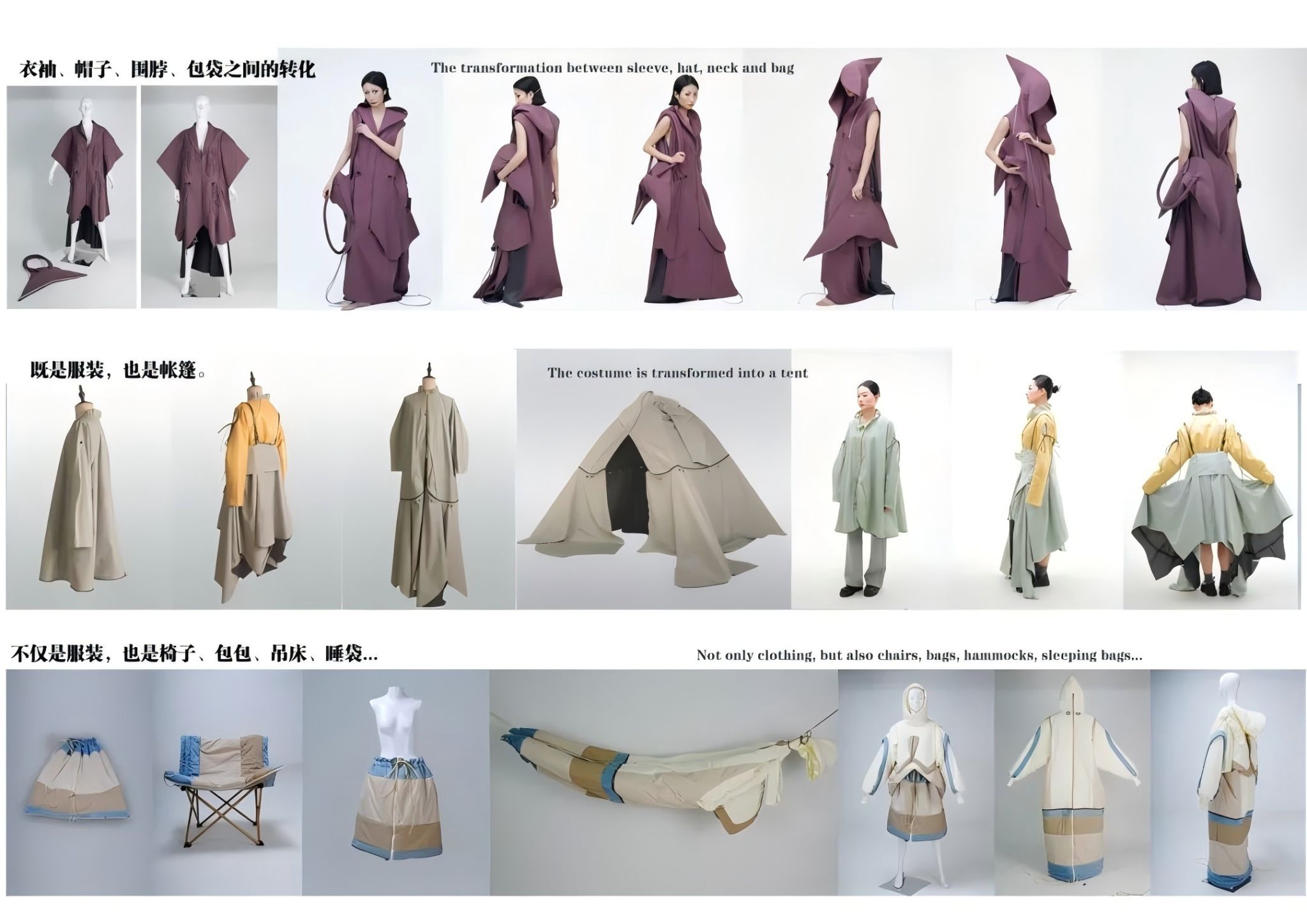 设计学院获奖创作者唐芮告诉记者:“我的作品聚焦山城重庆的‘棒棒军’群体,从他们对服饰的实际功能性需求出发,提出了‘服装是否可以成为临时居所’的初始构想。这一创意背后,是对劳动人民生活状态的深切观察与回应,也是对服装本质功能的重新审视。随着项目的深入,设计理念逐步拓展到广泛的劳动人民群体,融入绿色生活、健康生活的当代价值导向。”