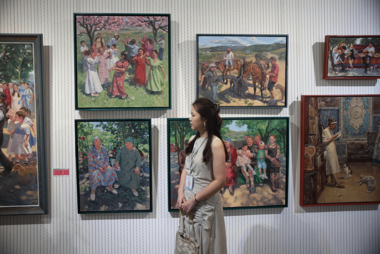 Wang Jianjia from the Department of Oil Painting presented "the New Life of the Kazakh People", blending vibrant and textured oil techniques to express her passion for Kazakh culture. "I aimed to capture their spiritual vitality in the new era—scenes of dancing under trees and herding horses," she explained. Using a unique method, she applied semi-dry paint as a base, sanded it for texture, and layered delicate brushstrokes to create a mottled effect.