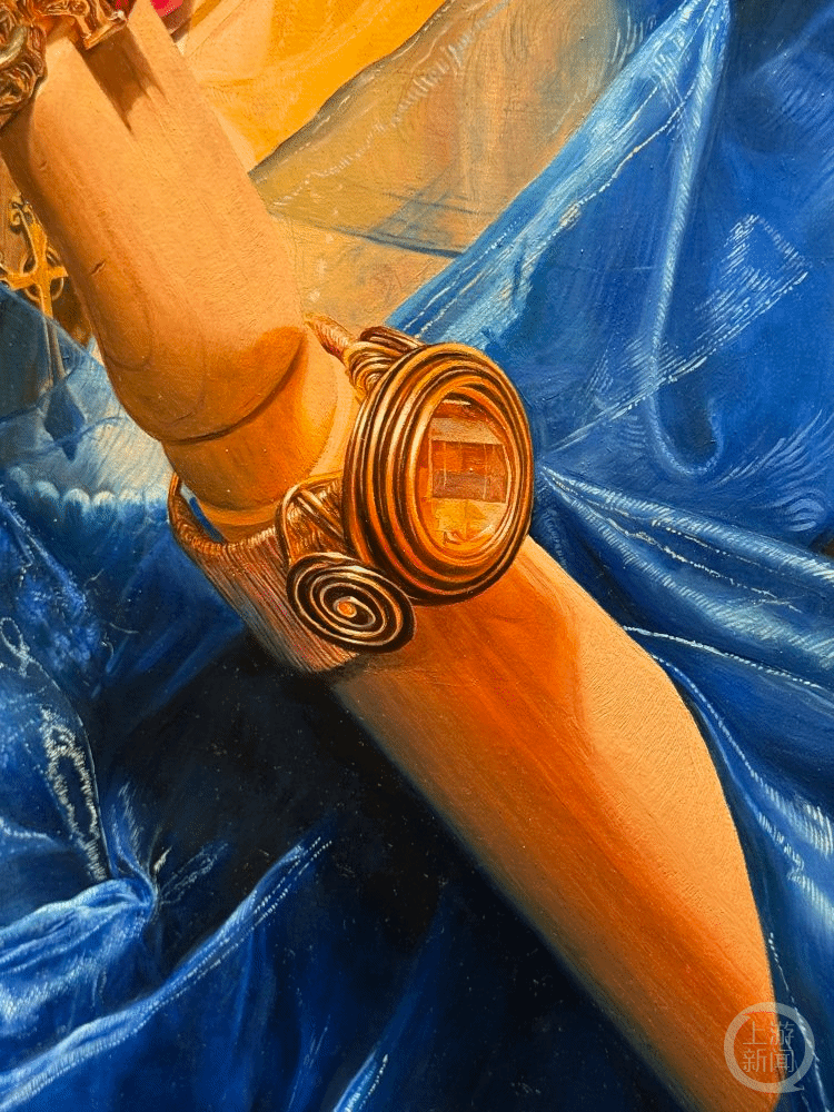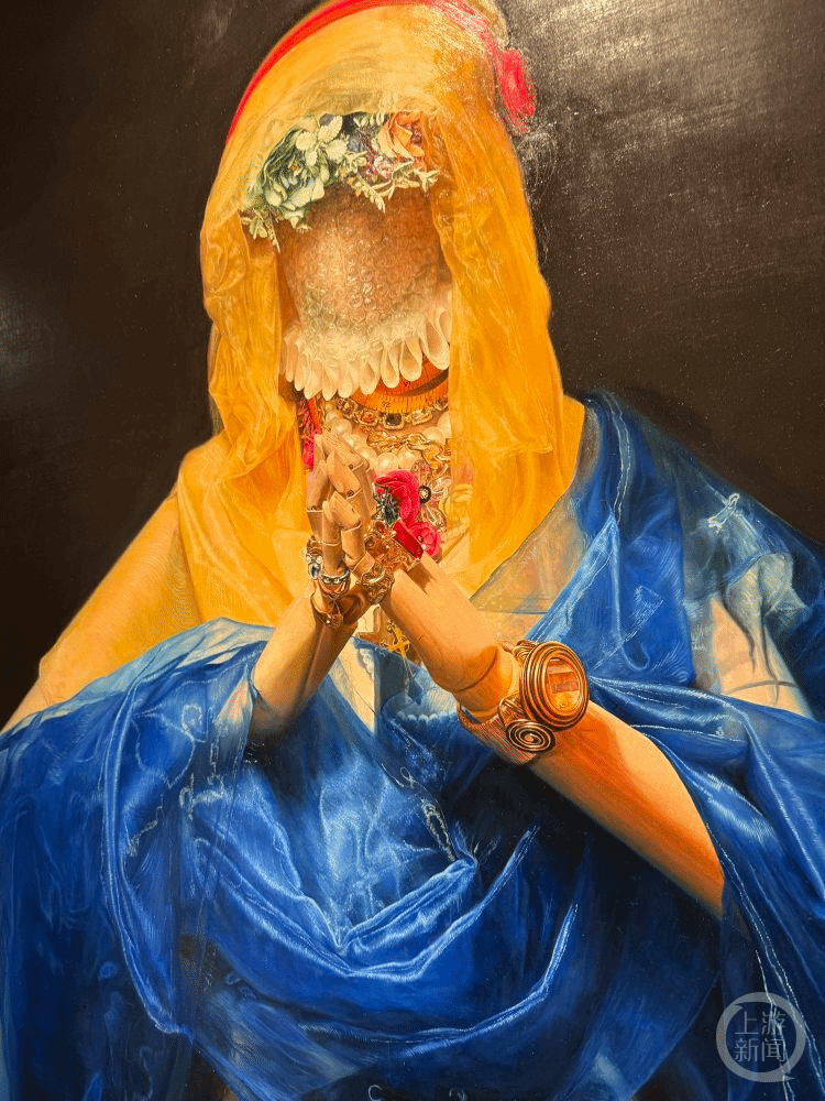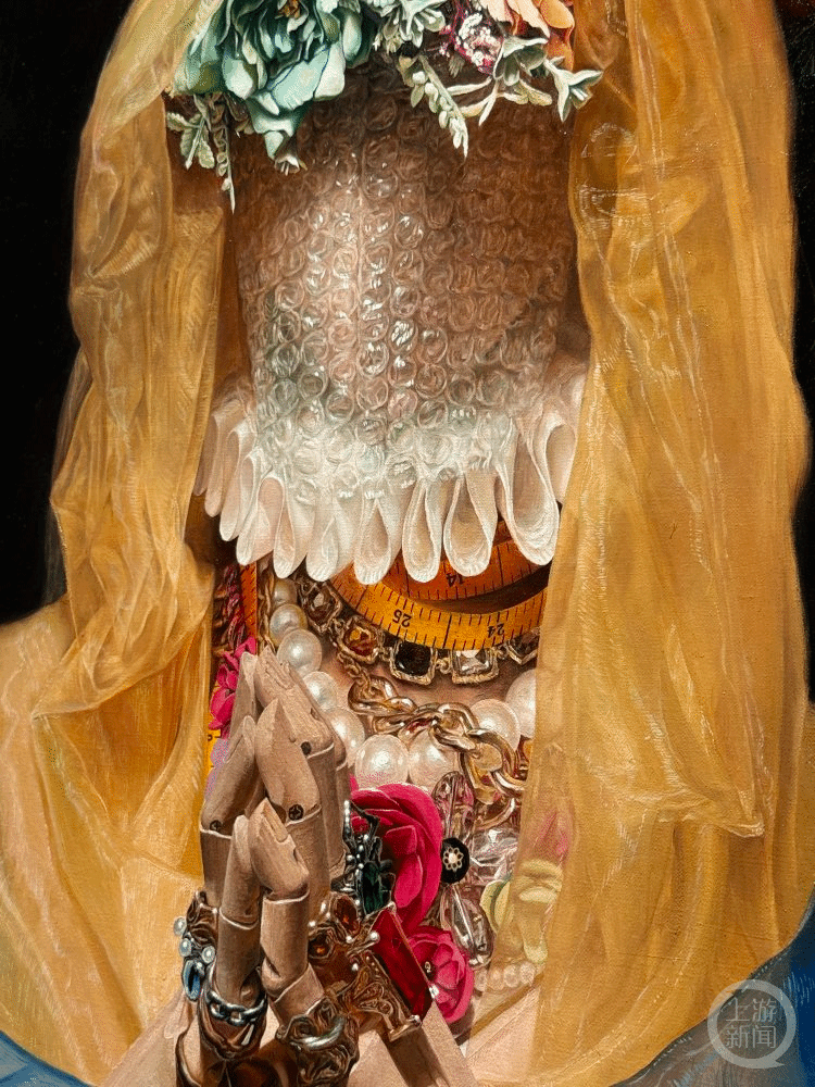 真正让无数观众感到惊喜和赞叹的是,越走近画作你就越能发现,作者对“模特”手部木纹的细致刻画,对蓝、黄两色纱巾弯曲、褶皱处光影的呈现,以及对气泡膜的描绘……都可以用几可乱真来形容。