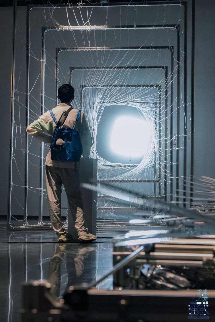 跨校合作作品《络》,以金属框架与塑料软管搭建出蜘蛛织网般的立体网状结构、虫穴般的交错通道,还原自然“络”的物理形态;同时作品中还以心率检测仪为桥梁,将人体抽象的心率信号转化为塑料软管内可见的水流脉动,让人体“生命脉络”的节律与自然“网络”的形态相互呼应。