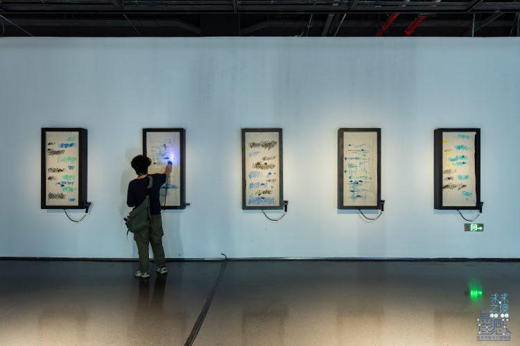 随观展路径组成的参观动线,直接就是作品中晕染的水墨潮痕;大家在展厅里挥挥手,就能让屏幕里的色彩跟着流动……