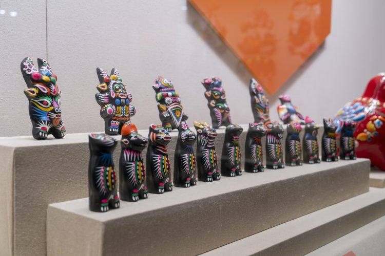 走进展厅,在第一单元“农耕与手工艺共生”里,上游记者首先看到的就是来自河南淮阳的泥泥狗(一种泥塑)。这种国家级非物质文化遗产最早起源于伏羲女娲“抟土造人”的传说,它有猫拉猴、九头鸟等百余种造型,既是当地太昊陵庙会的标志性手工艺品,也是承载原始信仰的文化符号。