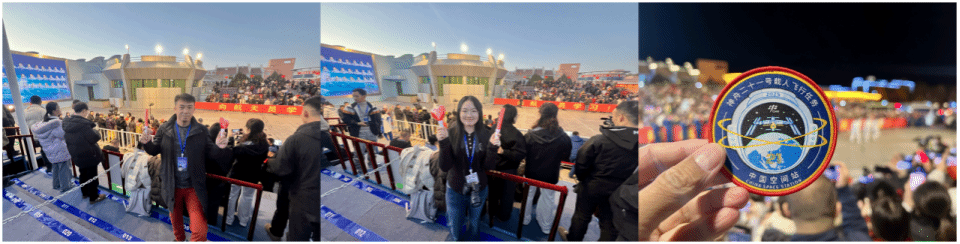 两位设计师受邀前往酒泉卫星发射中心观看发射,亲眼见证了张陆、武飞、张洪章三位航天员穿着印有自己设计标识的宇航服飞向太空。发射成功后,现场的董恬同学和顾欣教授激动不已,分享了这份源自现场的震撼与自豪。