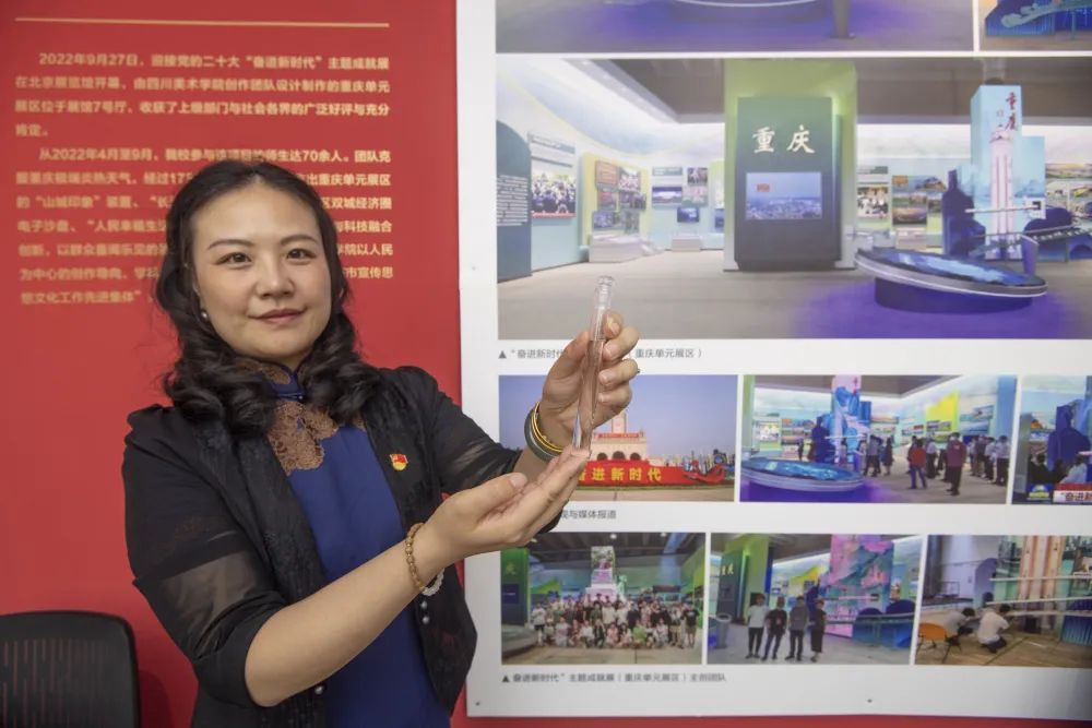 ▲5月4日, 五四主题团日活动,“奋进新时代”主题成就展(重庆单元展区)主题创作团队成员在介绍怎样将清澈的长江水融入设计装置作品中。记者 郑宇 摄/视觉重庆