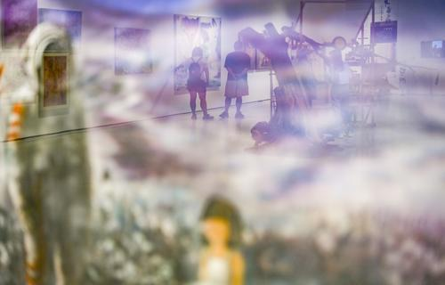 “比如这幅中国画《∞》,就颠覆了很多人对传统水墨中国画的印象。它用兼工带写的表现形式,将宿墨和鲜墨进行交错融合,描绘出一个凝望画外的未来幻想世界,太有创意了。又比如这幅油画《LLLLLL》,使用综合材料和拼贴手法,把打印照片、塑料袋、奥特曼卡片等,进行剪裁、拼贴和重叠,让画面的层次更加丰富,十分新颖。”她说。