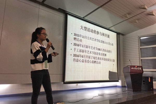 10月24日晚6点,公共艺术学院2015-2016学年青年志愿者协会工作总结表彰暨换届会在黄桷坪校区学术报告厅召开。公共艺术学院党总支副书记郭小兵、辅导员老师和公共艺术学院青年志愿者协会全体成员参加了此次会议。