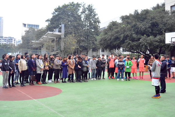郭小兵为篮球赛致辞,他提出,公共艺术学院为了响应团中央“走下网络、走出宿舍、走向操场”的号召,推动大学生素质全面发展而举办此次篮球赛,期待各参赛队伍都能有精彩的表现。裁判员代表、运动员代表分别宣誓致辞。随后三对三篮球赛初级选拔赛正式开始。