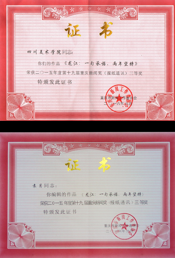 近日,在第十九届重庆新闻奖和2015年度中国高校校报好新闻评选中,我校校报《 报》多件作品获奖。其中,在重庆市新闻工作者协会主办的重庆新闻奖评选中,《龙江:一句承诺,两年坚持》(李霈箐、刘禹杰、张啸晗、赵迎昭)获得报纸通讯类三等奖,该作品同时还获得编辑奖。在中国高校校报协会主办的中国高校校报好新闻评选中,校报第278期第02版(袁月编辑)获得版面类二等奖;《创业,是梦想而非潮流》(李霈箐)获得言论类二等奖;《天气正好 下地干活》(杨勇)获得摄影类三等奖;《龙江:一句承诺,两年坚持》再获通讯类三等奖。