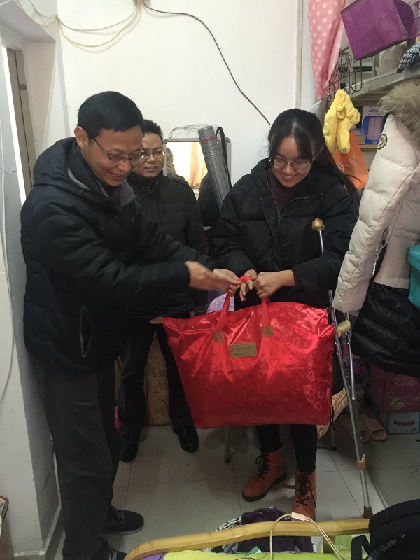 冬季送温暖,情暖学子心。12月22日下午,公共艺术学院党总支书记钟正武、党总支副书记郭小兵和辅导员一行深入学生寝室开展送温暖活动,看望慰问贫困学生党员4名、困难学生40名。慰问过程中,钟正武详细了解了同学们的学习和生活状况,向他们传达了我校对贫困学生的关怀之心,并送上了新年祝福。同学们深受感动,表示要克服困难,勤奋学习,不辜负学校领导的期望。老师们也表示希望更多的师生加入关爱贫困学生的群体,让更多的学生感受到学校和国家对他们的关心帮助,借此契机,让学生学会感恩,同时也能为公共艺术学院创造更和谐的人文环境起到良好的促进作用,推动学院精神文明建设。