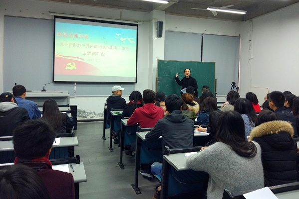 3月3日下午,影视动画学院党总支在A栋102教室开展《关于新形势下党内政治生活的若干准则》学习和主题创作会。影视动画学院党总支高度重视党的十八届六中全会精神的学习,在学校党委布置深入学习贯彻《准则》和开展主题创作的任务后,影视动画学院党总支组织师生对《准则》进行了学习,并由院长周小波和副院长周宗凯亲自指导,带领由教师党员、学生党员、积极分子、学生干部、普通同学等组成的50余名师生创作团队进行了主题创作。学校党委书记黄政也莅临创作现场指导工作,并亲切慰问了全体创作团队师生。