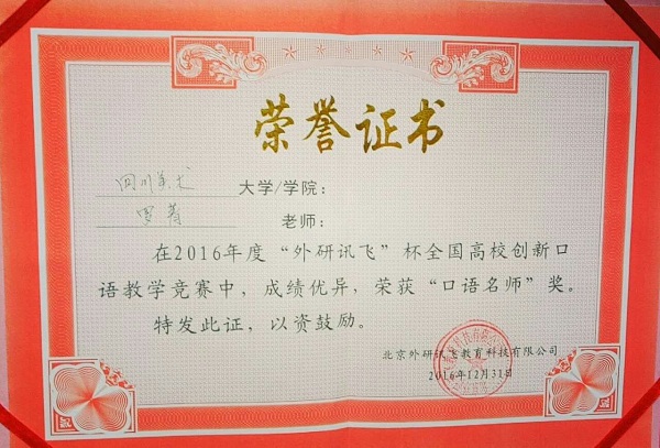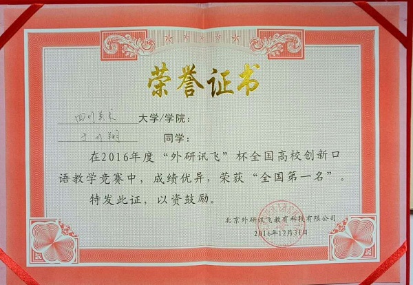 在2016年度“外研讯飞“杯全国高校创新口语教学竞赛中,我校公共艺术学院大一学生于川翔同学从全国36万名参赛大学生中脱颖而出,以优异的成绩获得了全国第一名的佳绩,指导老师罗菁获得了“口语名师”奖。