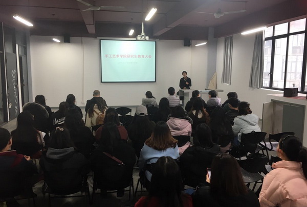 3月7日,手工艺术学院2017年新学期研究生教育大会在G栋学院多功能教室举行。学院党总支书记郑川、副院长谢亚平、辅导员杨洋及全体研究生参加会议。