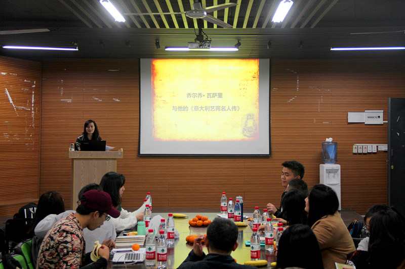 研究生代表通过PPT展示关于乔尔乔-瓦萨里的《意大利艺苑名人传》的阅读成果,简单梳理了瓦萨里的成就和其学术史,讲解了该书序言与《弗洛伦萨画家、雕塑家和建筑师米开朗琪罗》的意义,以此来探讨关于可视艺术的发展——从教堂到博物馆。随后,大家就“艺术的定义随着时代而发生变化”、“艺术史研究的意义”、“中国美术史和外国美术史是否有着同样可寻的线索”以及“博物馆与艺术品的定义问题”展开讨论。