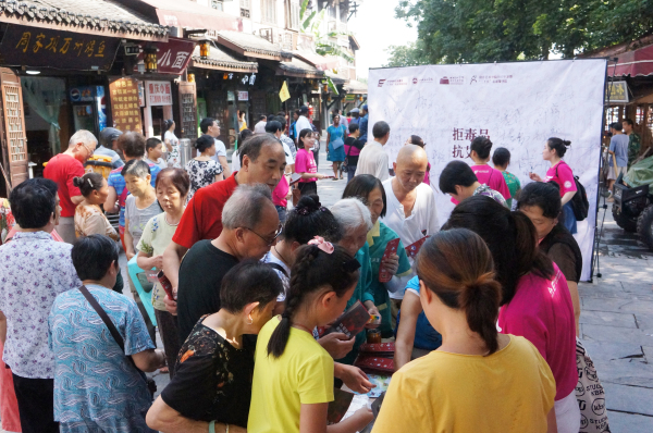 活动中,设计艺术学院首先围绕“拒毒品、抗艾滋”的主题,走进磁器口金碧社区,开展禁毒防艾的公益宣传活动。通过“拒毒品、抗艾滋的开幕式”、“志愿者宣传讲解发放传单”、“社区居民签名做承诺”、“主题互动游戏与有奖问答”等环节,吸引了不少市民参与其中,他们自主在签名墙上签名以承诺“拒毒品、抗艾滋”。该活动呼吁人们树立健康文明的生活方式,共同保卫我们生命家园,取得了良好效果。