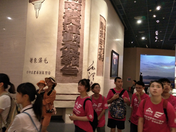 7月11至16日, 中国梦红色文化表情包设计实践团一行9人,来到韶山,实地参观、考察了毛泽东故居、毛泽东同志纪念馆。在毛泽东纪念馆,实践团队通过纪念馆工作人员的详细介绍和讲解,详尽了解学习了毛泽东同志为中华民族崛起,中国人民解放事业所奉献出的伟大的一生;了解了毛泽东同志在青年时期便确立个人伟大崇高的理想志向与奋斗目标,以及劝说家人加入革命,投身到人民解放事业中的光辉事迹。毛泽东主席生平事迹和人格风范,深深鼓舞着青年学子,爱国主义教育意义巨大。毛泽东同志的事迹、思想、风范,永远鼓舞着中国共产党和全国各族人民,坚定不移沿着中国特色社会主义道路奋勇前进。