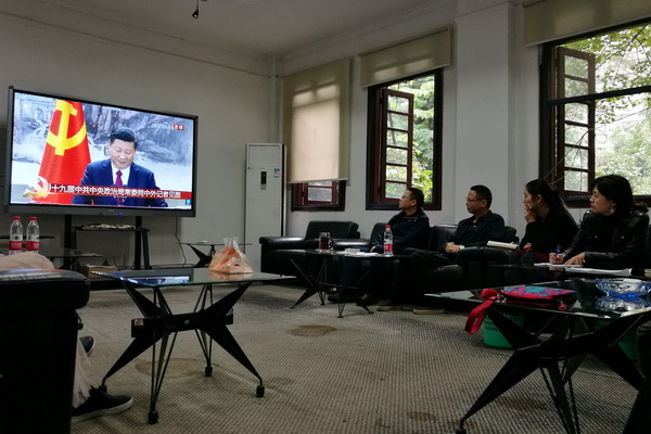 10月25日上午11点45分,为全面及时地学习党的十九大精神,公共艺术学院在黄桷坪校区红楼二楼会议室组织部分教职工收看了新一届中共中央政治局常委同中外记者见面会。在座教师聚精会神,认真收看,一致认为新一届中央政治局常委展现了新形象、新作风,都对全面建成小康社会和建设中国特色社会主义充满信心。
