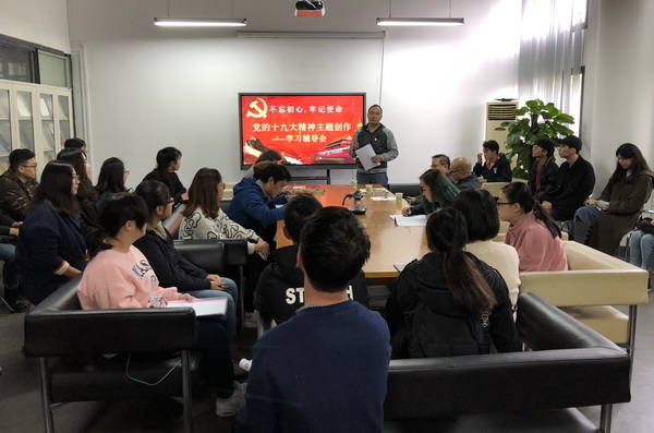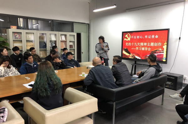 系党总支书记胡刚为全体参会师生梳理了十九大的重点内容,介绍了十九大的盛况及会议成果,讲解了党的十九大主要精神,分析了党章修改的内容及各项事宜,从理论角度启发师生创作视角。