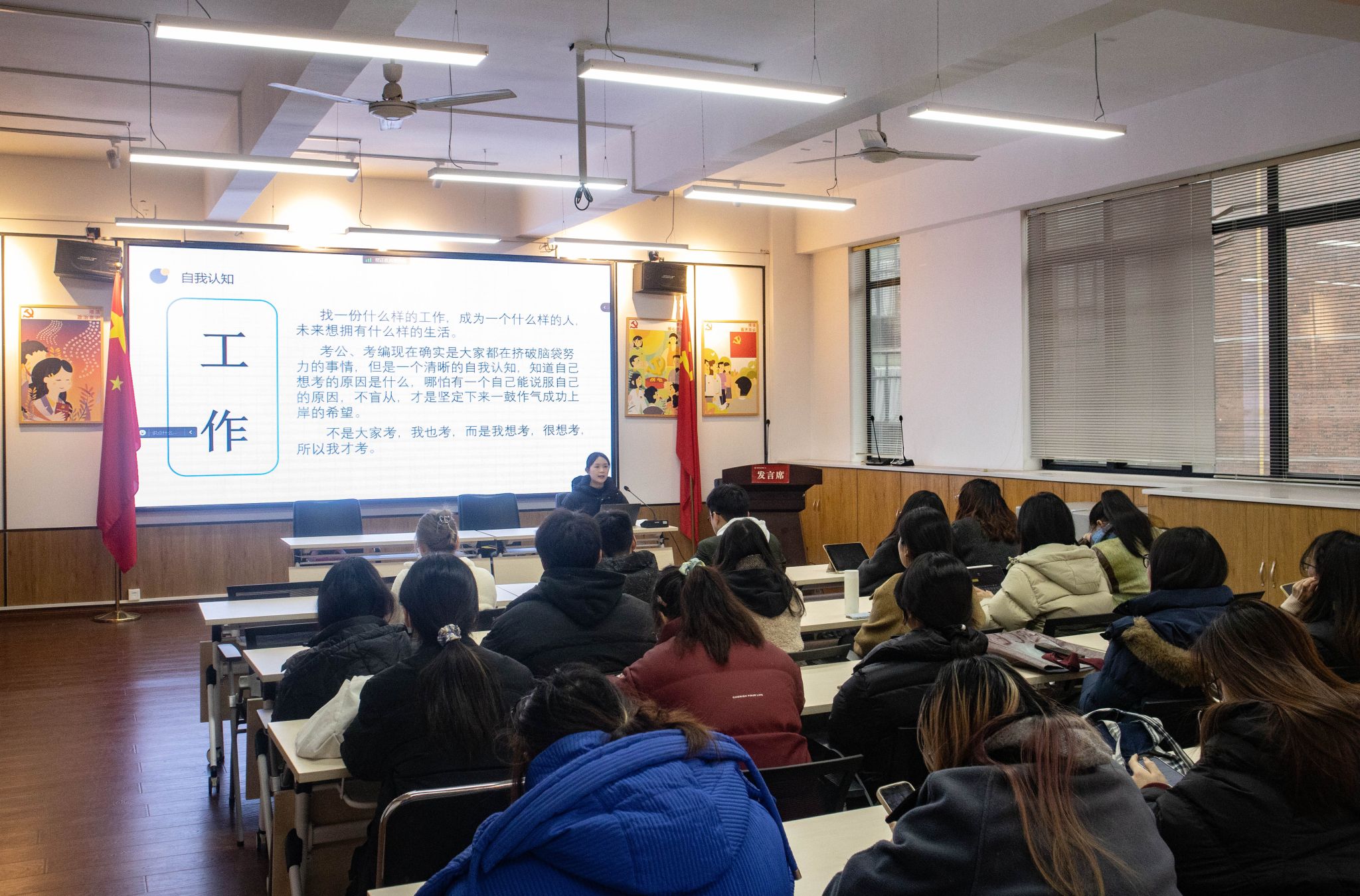 设计学院新进辅导员张宁带来了考公考编经验分享。张宁详细阐述了公务员考试与事业单位考试的区别,深入分享了考编流程以及实用的考试策略与技巧。在互动环节,张宁耐心解答同学们的疑问,并给予提升综合素质的宝贵建议,帮助同学们全面掌握公务员考试流程和备考策略。
