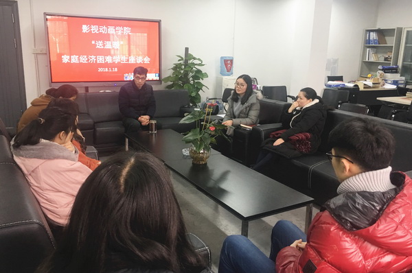 2018年1月18日下午2点半,影视动画学院召开2018年“送温暖”家庭经济困难学生座谈会,对家庭经济困难学生代表进行慰问,了解家庭经济困难学生在学习、生活方面的具体情况,对他们在学业、生活方面的困难和问题进行了解答和指导。影视动画学院党总支书记柏在华、辅导员老师及7名家庭经济困难学生代表参加了会议。