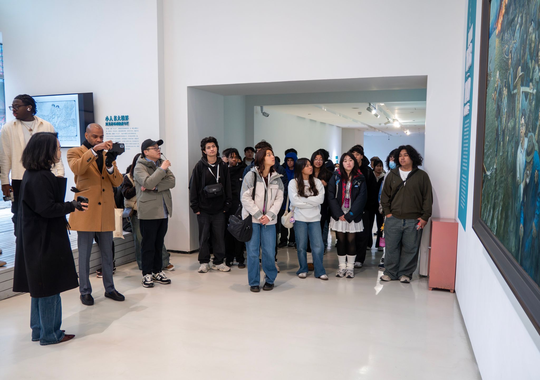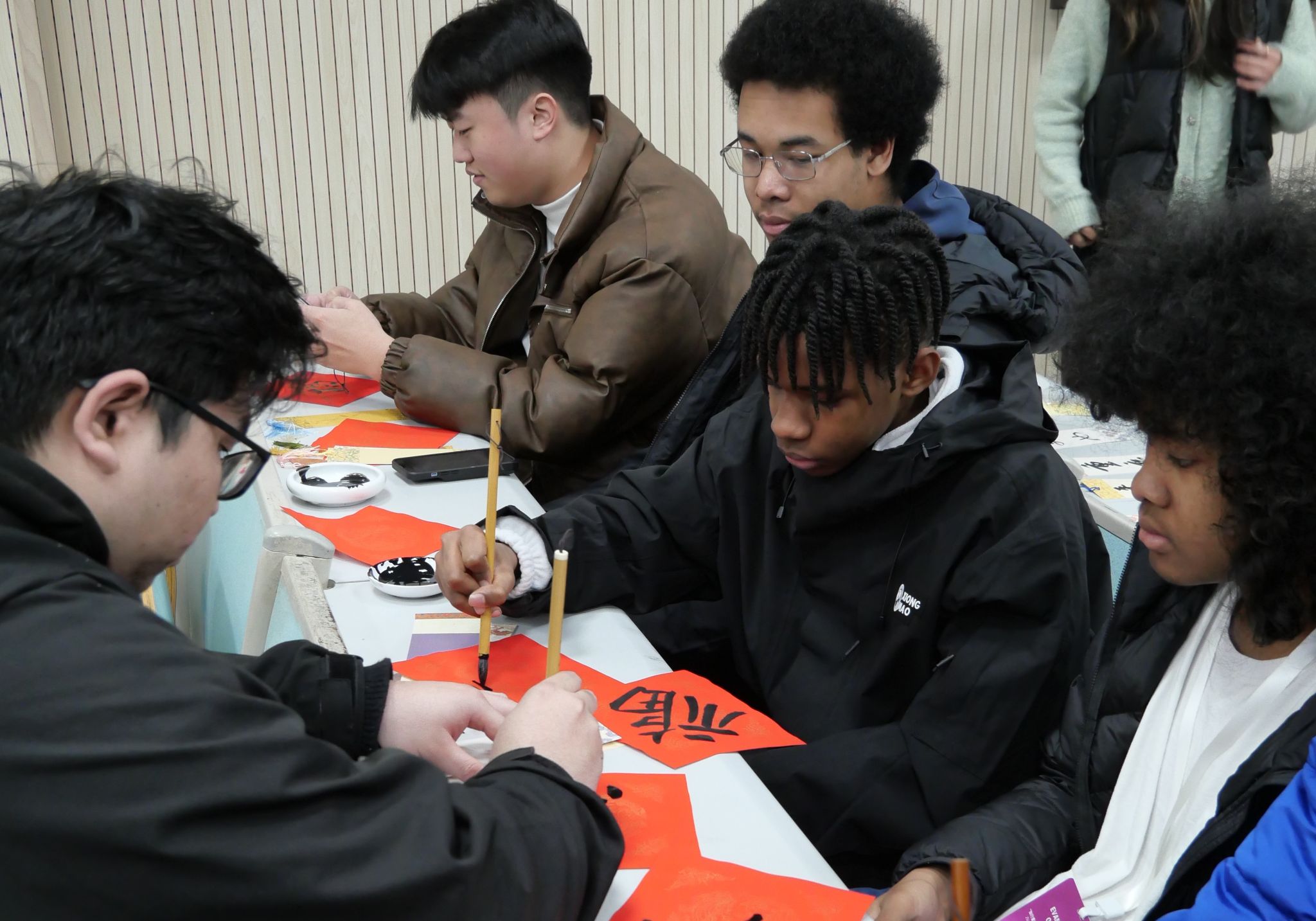 交流团首先参观了我校美术馆,学生们对中国传统的国画、漆画等非常感兴趣,纷纷在作品前拍照留念。随后,中国画与书法艺术学院教师为交流团做《中国诗歌与书法》英文讲座。讲座结束后,访问团成员在中国画与书法艺术学院学生的指导下,完成了书法的“初体验”,他们用中文写下了自己的名字和新春祝福。美国学生纷纷表示,这次中国书法体验非常有趣,是一次非常有意义的尝试。