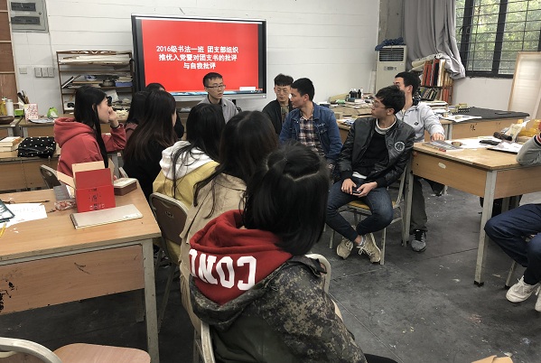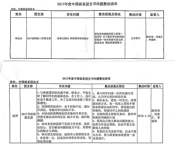 一是开展团支书2017年度述职、以团支部开展了批评与自我批评。中国画系全面开展了每个同学的具体问题查摆、落实整改,落实民主评议精神,将问题查摆整改实施到每个学生中去。由学生会主席、团总支书记、班主任作为各学生的问题查摆监督人,将学风班风建设落到实处,以全面从严治党为契机,全面抓好学风班风建设,改善团支部的作风,提高班级凝聚力。
