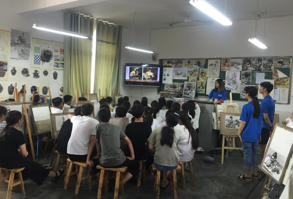从7月13日开始,8名同学分为三组,分别为八年级和九年级的三个班教授了素描、色彩和创作三种课程。课程内容由同学们精心设计,紧紧贴合两个年级的绘画水平和兴趣所在,几天的教学活动下来,雕塑系的同学们和当地的学生结下了深厚的友谊。