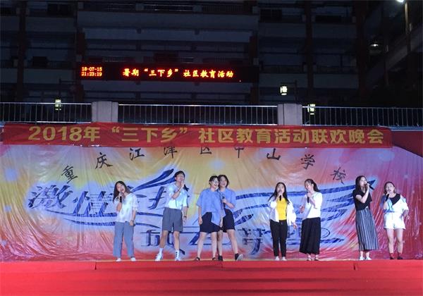7月15日晚,中山学校还组织了一场“三下乡社区教育活动联欢晚会”。中山学校的师生、江津二中的教师、江津区音乐舞蹈协会和雕塑系的同学们联袂为大家带来一场精彩的晚会,在晚会的结尾,雕塑系同学们为大家带来了两首歌曲,为晚会划上了圆满的句号。