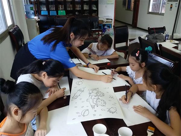 开班第一天,为了保证活动的顺利进行,实践团成员们早早地来到活动现场布置场地:安排桌椅、准备绘画材料,迎接小朋友们的到来。7月12日上午9时,在“筑梦初心”绘画班开班仪式上,为拉近志愿者与小朋友们的距离,志愿者与小朋友依次做了自我介绍。整个过程大家都热情洋溢,表现出极高的参与度与想象力。