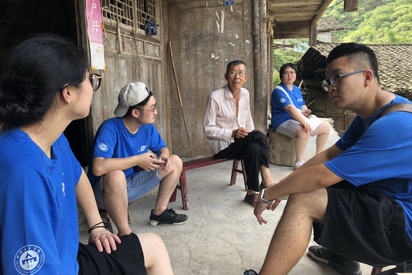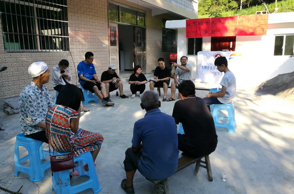 在尚未有硬化路面的金溪镇十组,同学们步行一公里碎石路,深入乡村,开展与村民的“以党的十九大精神“三下乡”——乡村文化振兴座谈会”,收集村民意见7条,在乡村振兴、发展产业、乡村文化建设、乡村电商四个方面进行广泛深入交流,并将调研结果反馈给十组的扶贫书记。