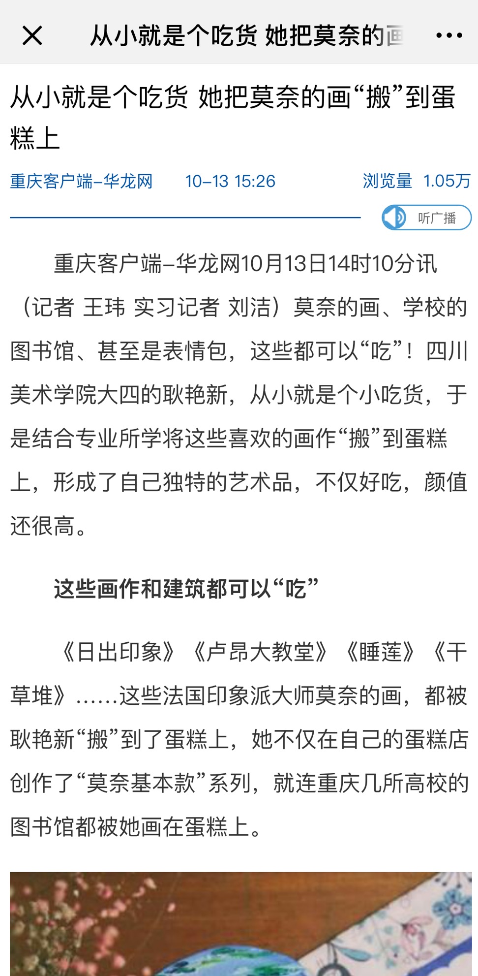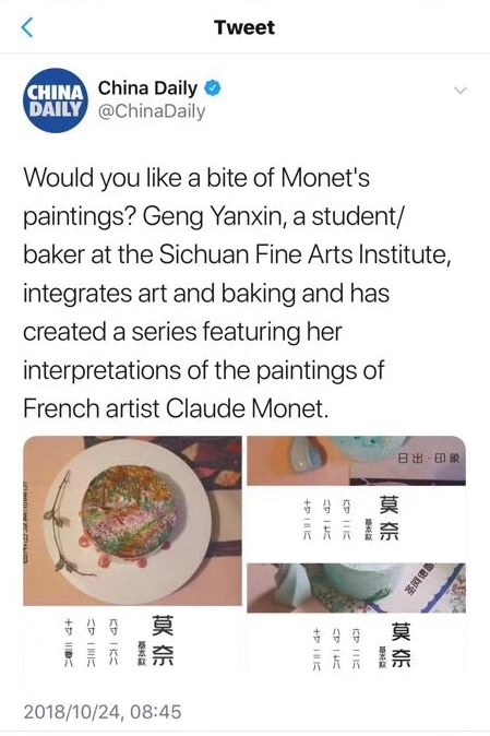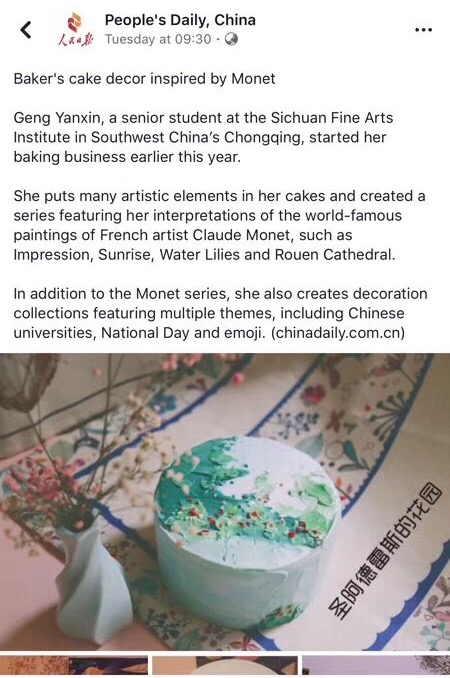 我校2015级设计策划与管理专业耿艳新同学,在今年9月份创办了“画上为名—艺术蛋糕工作室”。她结合学校的艺术专业特长,将绘画与蛋糕制作相结合,产生了全新的艺术蛋糕产品。《日出印象》、《卢昂大教堂》、《睡莲》等这些法国印象派大师莫奈的画,被都她搬到蛋糕上。国庆节前,还推出了高校纪念款蛋糕(川美、重大、重师)、国庆特别款蛋糕。她想通过手绘的形式直观地表现用户情感,把蛋糕作为连接艺术和生活的桥梁,以提升人们的艺术生活理念,传递艺术生活的观念,增强用户的幸福感。