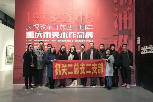 最后,机关二总支二支部全体党员还参观学习了正在重庆美术馆举办的“潮涌两江——庆祝改革开放四十周年重庆市美术作品展”。在展览现场感受了改革开放四十年来,重庆美术界响应时代号召,坚持以人民为中心的创作导向,不断以美术作品反映四十年来的社会发展以及在社会主义现代化建设中所发挥的独特作用。