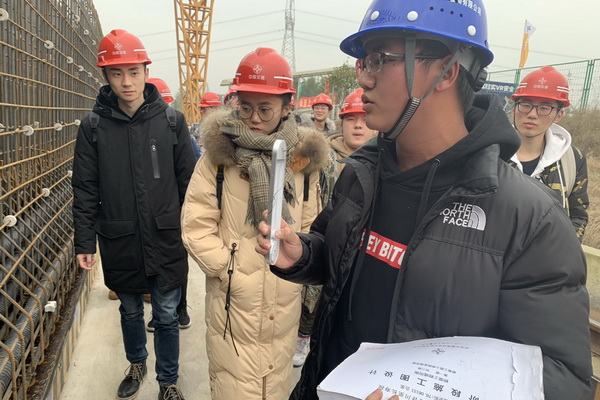 会后,项目部带领支部同学到大桥建设一线近距离感受了最真实最直观的生产建设场景,参观了桥梁预制T梁场,听现场质检员介绍了预制T梁的施工工艺。在近距离面对众多高两米五、长达四十米的庞然大物时,学生党员同志们无不赞叹建设者的聪明才智,无不感叹座座桥梁平地起是伴随着建设者的艰苦奋斗。