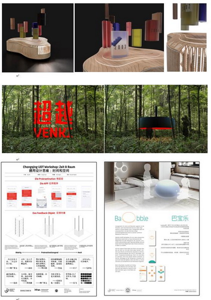 此次设计工作坊围绕“时间/空间”抽象概念的广泛探索到最终设计概念的执行,充分体现了在文化碰撞中开展设计协作的价值和意义。在头脑风暴阶段,德方教授让同学们在最短时间内通过3轮各具特色的方法来完成概念的发散与聚焦,学生们的每个想法都会得到教授们的肯定和赞扬,增强了学生对自己设计想法的自信心,同时,教授们也会根据概念的特点给予明确的方向。在概念推进和细节设计阶段,教授们不断给予建设性的引导,启发学生围绕用户群落、产品功能、材料造型与绿色可持续、文化交叉、特殊人群以及社会问题的联系和探讨。在整体解决方案最终汇报展示中,反映出中德学生更为综合地考量个体与社会的实际问题和真实需求,努力探索设计方案与情感连接、哲学概念、美学价值、人性化体验等不同层面之间的关联与畅想。