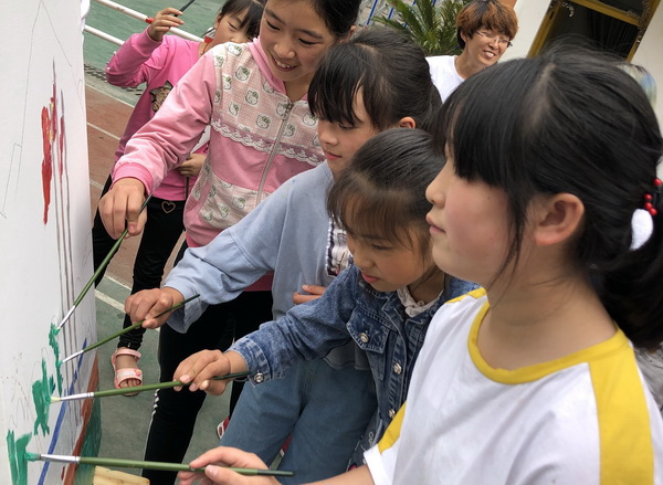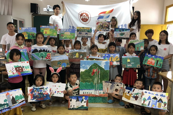 7月16日,同学们在当地扶贫干部的带领下来到了天元小学,为留守儿童带去了一整天别开生面的艺术体验活动。此次活动主要分两项流程:首先,在我校志愿者们的帮助下,每位小朋友以“我爱我的祖国”或“我爱我家”为主题,创作了一幅自己心目中的画作;然后在志愿者们与全体小朋友的通力合作下,绘制了一幅校园写生作品,并在活动结束后以 油画系三下乡实践团队的名义将这幅作品捐给了天元乡小学,同时也为当地小朋友捐赠了绘画工具,鼓励他们将生活中的美好用画笔记录下来,希望他们能热爱艺术、热爱生活。