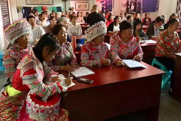 本次培训班为了把扎染技术发展得更好更持久,在叙永县支持下,成立了“叙永县扎染蜡染苗绣专业合作社”(简称专合社)。由专合社和乡镇领导挑选了42名村民,来自摩尼镇、西溪村、麻城镇、合乐乡、枧槽乡、白腊乡六个乡镇。年龄最大的73岁,最小的11岁。钟茂兰结合村民们原有作品进行评讲,再传授构图、纹样的基本规律、技法及色彩搭配知识等,寄望村民们把扎染再提高,再上新水平。