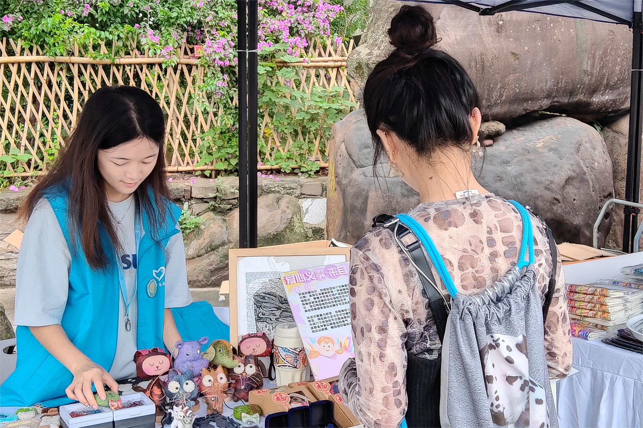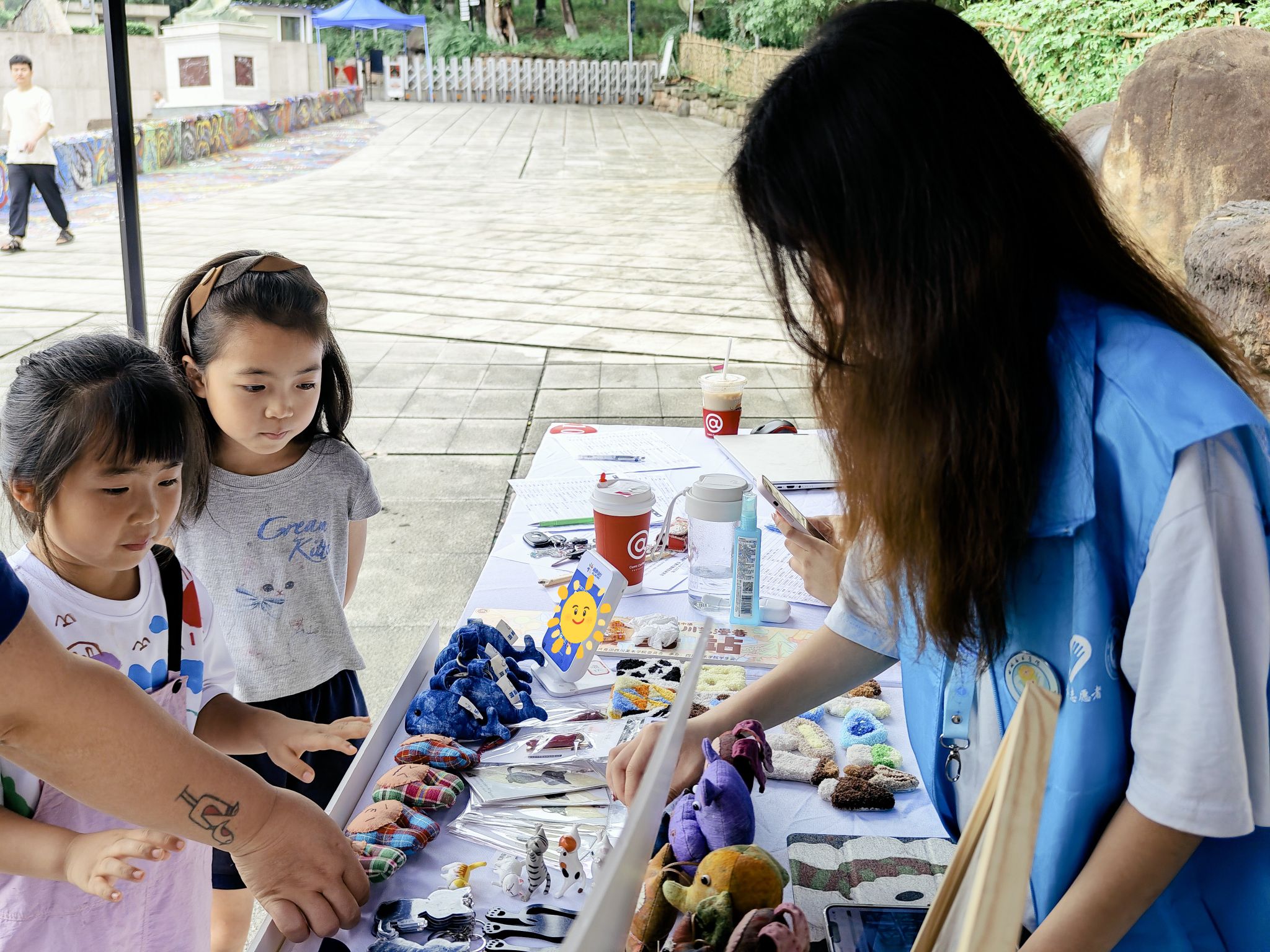 “艺小青”志愿服务队联合“馨小青”助残青年志愿服务分队以川美“川艺漫巷”创意市集为契机,在 美术馆前广场开展助残义卖活动。义卖摊位上的每一件蓝鲸挂饰、二狗钥匙扣、黑猫书签等文创产品的图案均来自于孤独症群体绘画活动成品的艺术化加工与转化,这些物品凝结着孤独症创作者丰富的内心世界和未被充分认知的艺术天赋。在爱心摊位前,志愿者们耐心细致地介绍各类义卖物品、讲述义卖公益行动背后的故事。游客在体验和交流中也近距离、多方面地了解到“星星的孩子”。义卖的全部收入将捐赠给星火公益,用于助残事业。