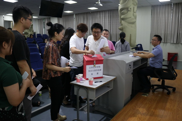 郭小兵同志宣读了中共 委员会文件《关于同意公共艺术学院党总支委员会委员候选人人选和下设党支部书记候选人人选的批复》。接着大会宣读并讨论通过了选举办法后,进行无记名差额投票选举。本次选举应到有选举权的正式党员35名,因病因事请假3名,实际到会有选举权的正式党员32名。通过监票人、计票人和唱票人统计,选举产生了新一届公共艺术学院党总支委员会委员7名:杨洋、胡经菁、郭小兵、陶涛、谢琦琦、雍朝永、谭簧。