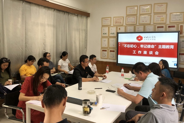 9月23日下午, 为贯彻落实学校“不忘初心、牢记使命”主题教育相关工作会议精神,公共艺术学院党总支在黄桷坪校区党员活动室召开“不忘初心、牢记使命”主题教育工作会议。学院党政领导与各系部主任、教研室主任、党支部书记共同参加,会议由公共艺术学院副院长魏婷主持。