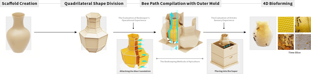 《4D Bioforming with Bees: An Industry-Compatible Prototyping Method for Polymorphic Honeycomb Creation》论文提出了一种“4D生物成型”方法,兼容传统养蜂产业的蜂巢原型制作方法,设计师与养蜂人共同合作,通过精心设计的支架引导蜜蜂筑造突破传统平板六边形的三维多态蜂巢结构,既保留蜜蜂自然筑巢的美感,又探索了新的蜂巢形态及其功能上的可能性。