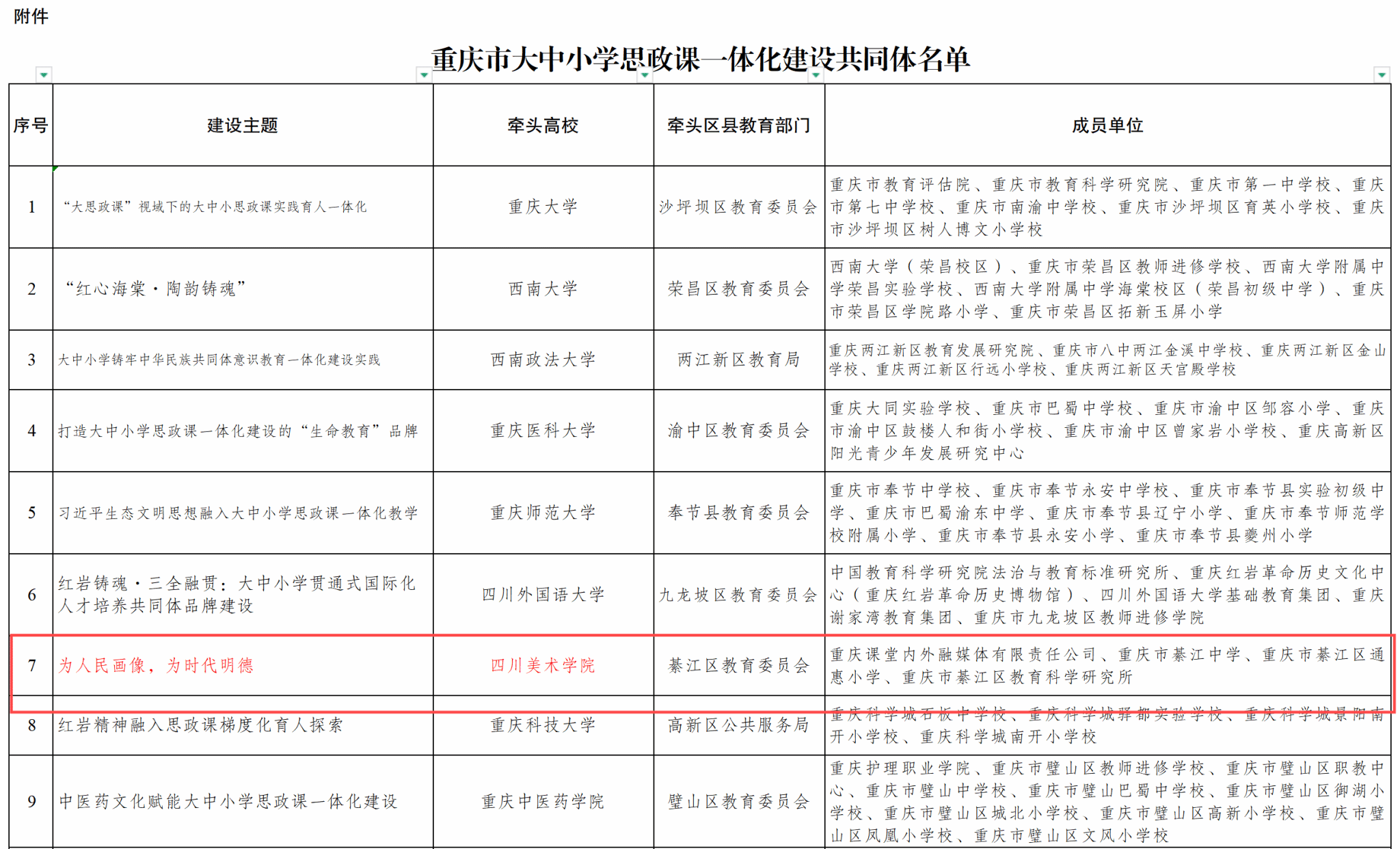 此次由我校牵头建设的重庆市大中小学思政课一体化共同体,以“为人民画像,为时代明德”为建设主题,将充分发挥我校在美育领域的优势,以“思政+美育”教学理念为引领,探索大中小学思政课一体化共同体建设的新方法,实现大中小学协同的五育并举教育新发展格局,为重庆市思政课一体化建设注入新的活力,助力培养德智体美劳全面发展的社会主义建设者和接班人。