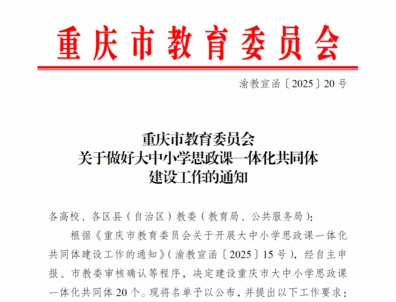 近日,根据《重庆市教育委员会关于做好大中小学思政课一体化共同体建设工作的通知》(渝教宣函〔2025〕20号),同意我校作为牵头高校,联合重庆市綦江区教育委员会等相关单位,共同建设重庆市大中小学思政课一体化共同体。