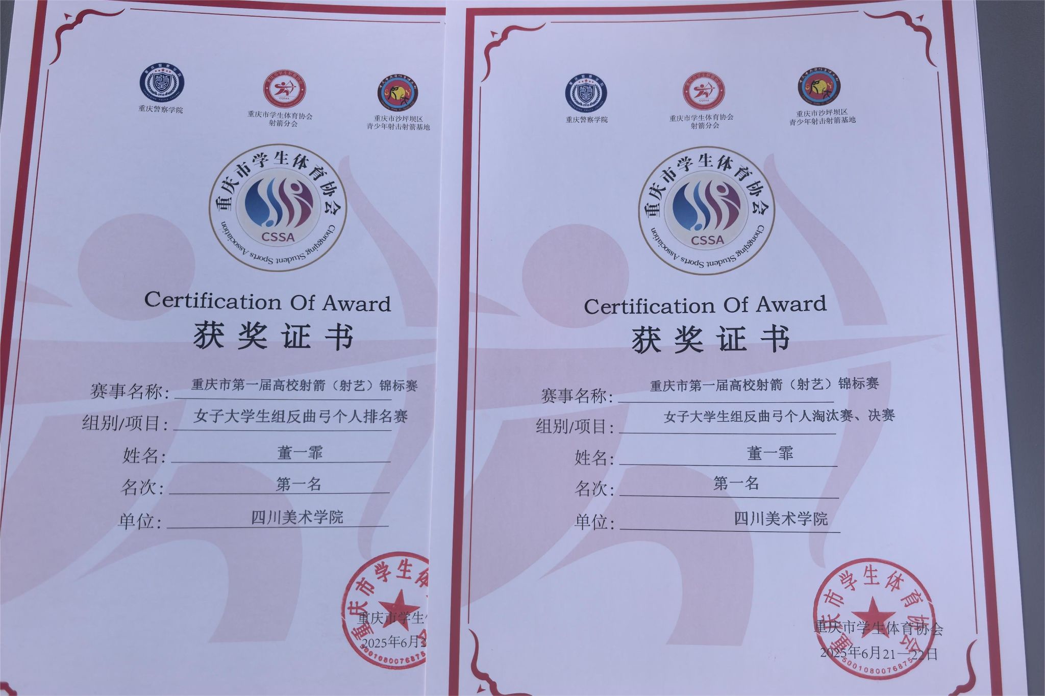 我校射箭队由通识学院体育教学部教师带队,2名运动员参加女子大学生组反曲弓排名赛和淘汰赛。尽管比赛当日暴雨绵延,但2位女运动员毫不退缩,以顽强意志与沉稳心态从容应战,充分彰显出川美学子锐意进取的精神风貌。凭借稳定发挥,一举荣获了2个第一名、1个第二名、1个第三名的优异成绩。